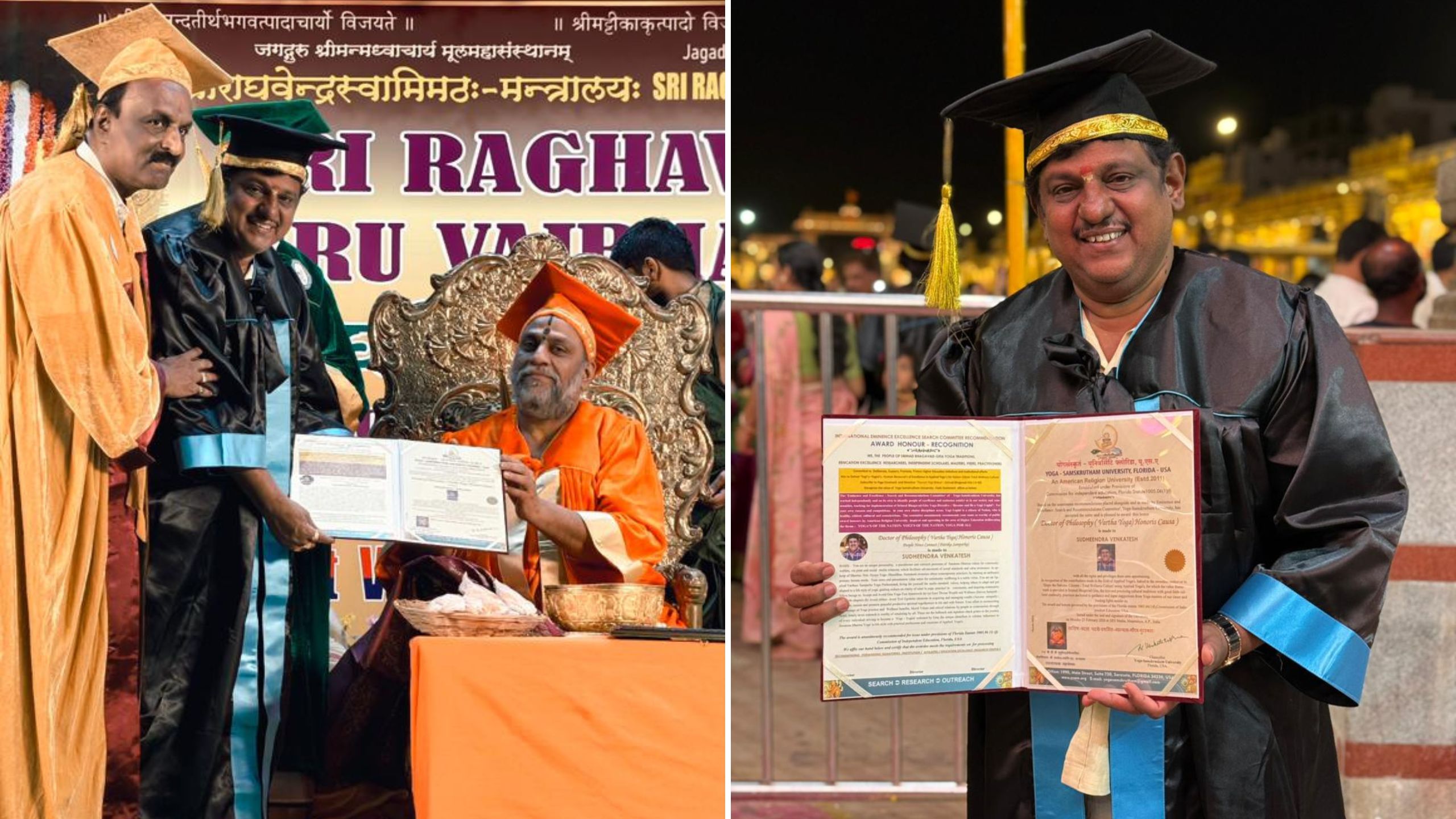 The honorary doctorate was presented on Monday at Mantralaya by Sri Subudhendra Theertha, Peethadhipathi of Sri Raghavendra Swamy Mutt. The recognition was given for Sudheendra Venkatesh’s contributions to the Kannada film industry over several years.